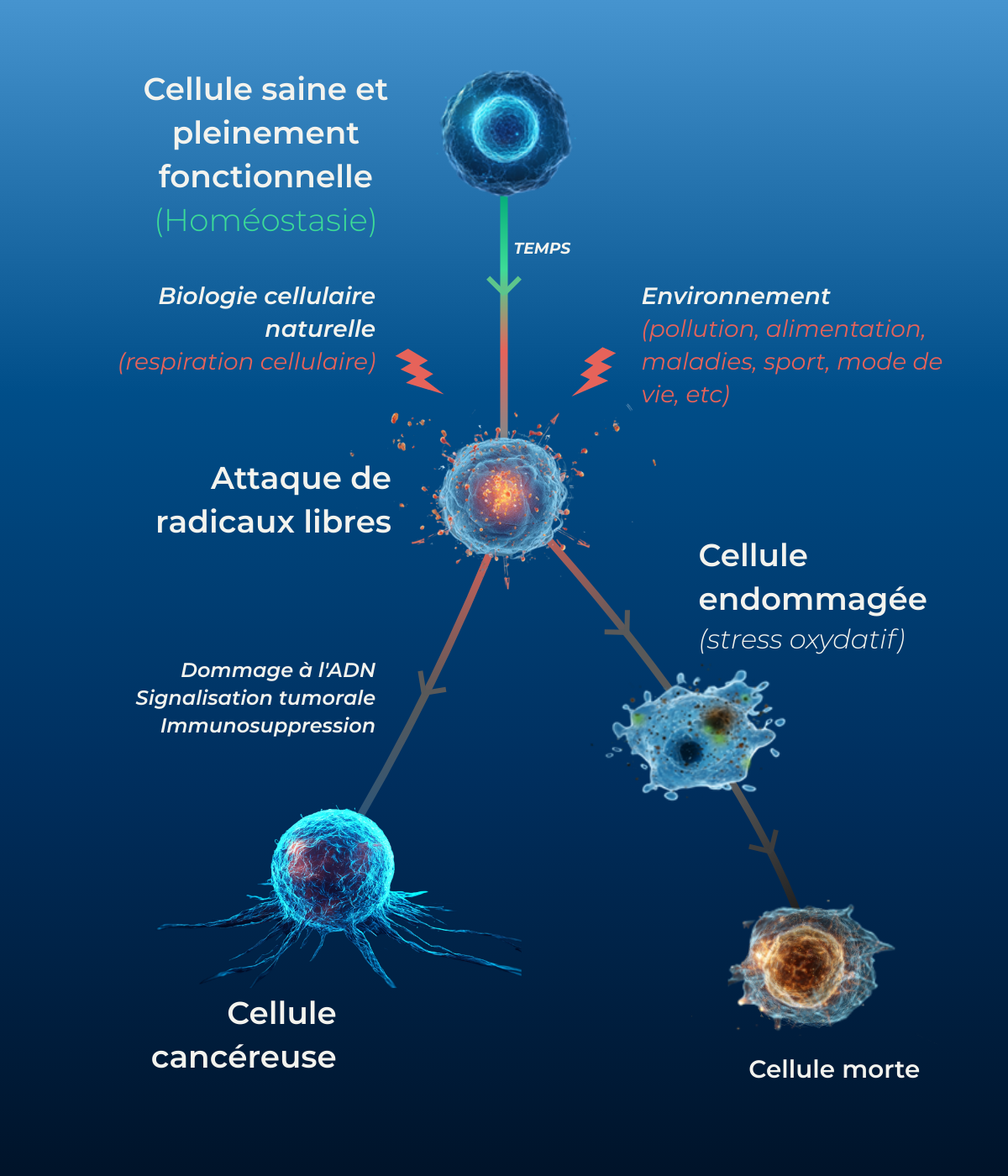 La vie naturelle d'une cellule saine dépend de sa capacité à maintenir son équilibre et à rester biologiquement claire, sans perturbation oxydative.